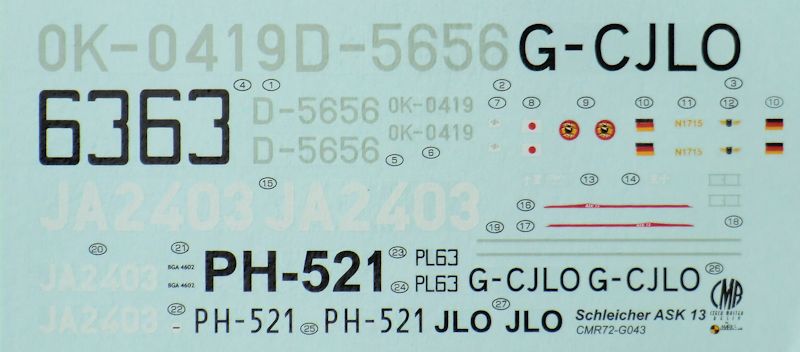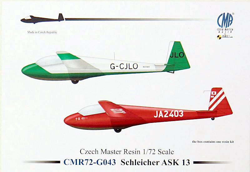 Bausatz: CMR liefert hier wieder ein interessantes Segelflugzeug aus Resin im Maßstab 1/72 aus. Weitere interessante Konstruktionen werden folgen. In dem stabilen Stülpkarton befinden sich gut verpackt elf Resinteile, zwei klare Vacuteile, ein großer Fotoätzteilbogen, ein Decal und die übersichtliche Bauanleitung.