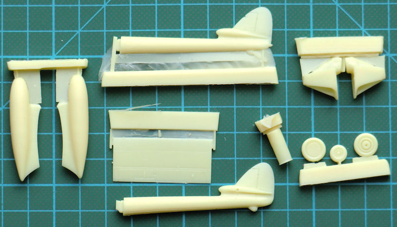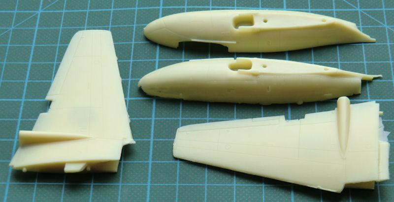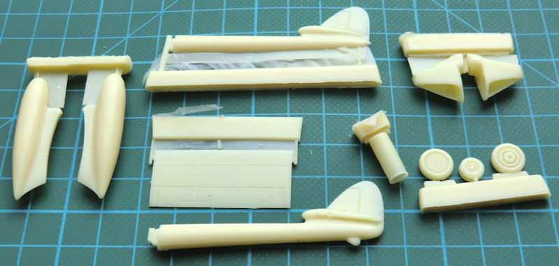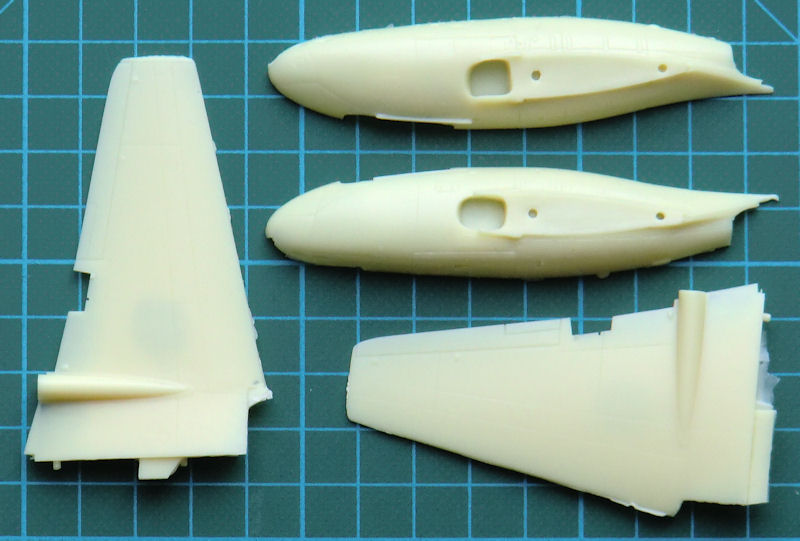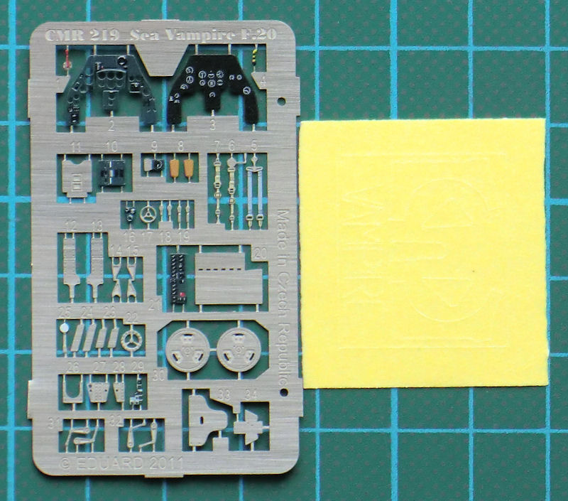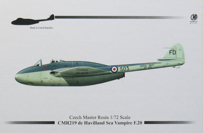 Bausatz: CMR hat seit einiger Zeit diverse Vampire Bausätze im Angebot und so lag es auch mal nahe eine Fleet Air Arm F.20 zu liefern. Diese gab es zuvor noch nie als Bausatz. Im stabilen Stülpkarton von CMR befinden sich gut verpackt 70 Resinteile, zwei Vacukanzeln, gelbe Masken, ein Fotoätzteilbogen, die übersichtliche Bauanleitung mit Vorbildteil und zwei Decalbögen. Ein paar Resinteile sind für andere Versionen vorgesehen und werden nicht benötigt.