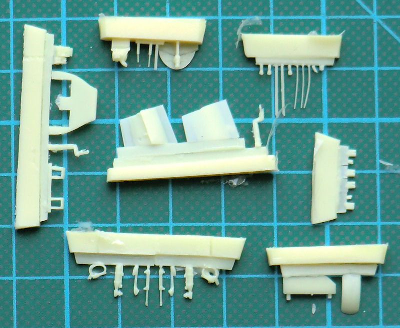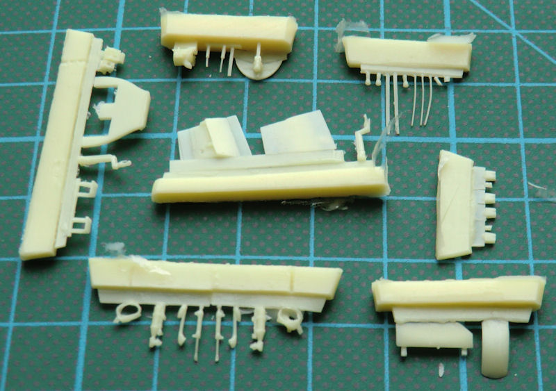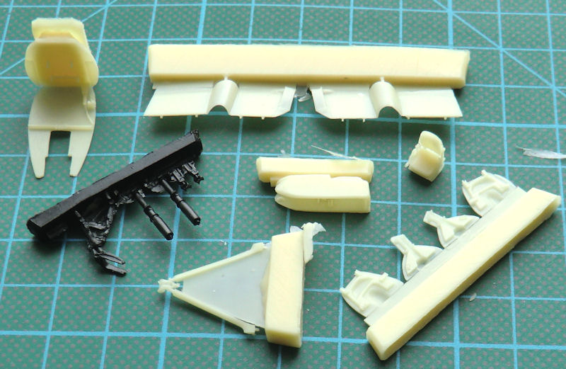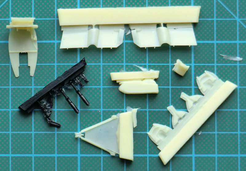 Der Fanghaken kann optional in abgesenkter oder eingefahrener Position montiert werden. Die Fahrwerksbeine bestehen in diesem Kit aus dem stabilen schwarzen Resin. Fahrwerksscheren und die äußeren Felgen der Hauptfahwerksteile sind aus Fotoätzteilen. Natürlich können die Landeklappen in ein- oder ausgefahrener Position montiert werden. Auffällig sind die über den Leitwerksausleger herüberreichenden großen Klappen. CMR liefert als einzige Außenlast zwei Zusatztanks für die Tragflächen mit. Ich kenne keine Fotos wo die Originale mit anderen Lasten flogen.
