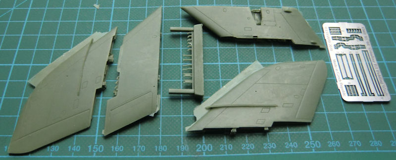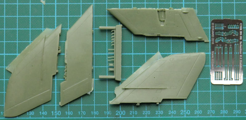 Die Teile aus dem Detailset ersetzen direkt die Bausatzteile. Mittels Fotoätzteile werden die Faltstellen der Flächen nachdetailliert und das Scharnier hergestellt. Als Stützen dienen Fotoätzteile. Im Vergleich zu den Originalteilen wirken diese etwas platt.