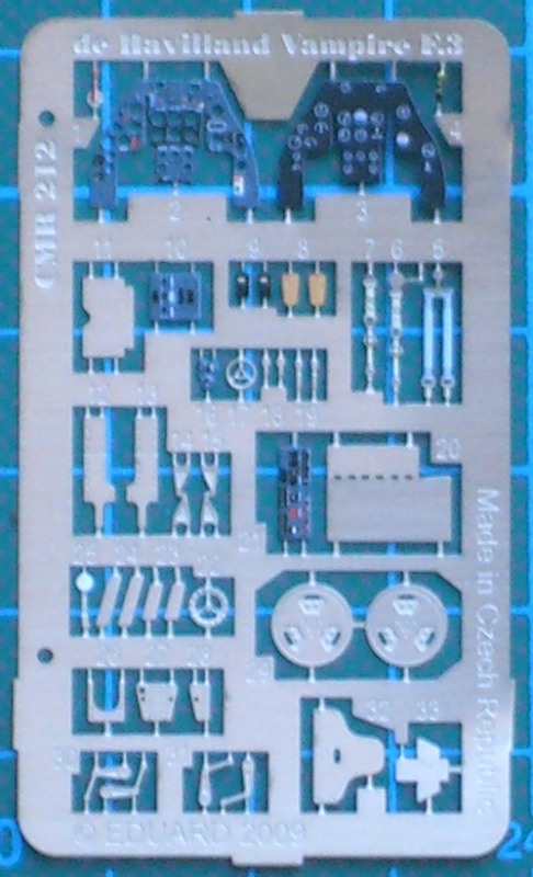 Interessant ist der detaillierte Guss des Abgasrohres der Strahlturbine. Hier gibt es innen Details satt. Bei der Vampire gibt es im Gegensatz zur Venom gute sog. Locations für die Verbindung von Tragfläche und Rumpf. Gut gemacht!! Ebenso gibt es Passstifte für das Höhenleitwerk. Die Lufteinläufe gibt es auch bei der F Mk. 3 separat und sie müssen mit Leitblechen aus den Fotoätzteilen versehen werden. Bei den beiden Leitwerken gibt es auch zur Tragfläche hin stabile Passzapfen. Die Streben des Fahrwerks bestehen aus stabilen schwarzem Resin. Bei den Hauptfahrwerksrädern gibt es für die Felgennachbildung zwei Fotoätzteile. Alle Landeklappen der Vampire können ein- oder ausgefahren montiert werden. Die Bauanleitung weißt richtiger weise darauf hin, dass bestimmte Teile erst nach der Lackierung angebaut werden können. Übrigens zur Lackierung: Die Vampire besteht zum großem Teil aus Kompositmaterial wie die Mosquito!