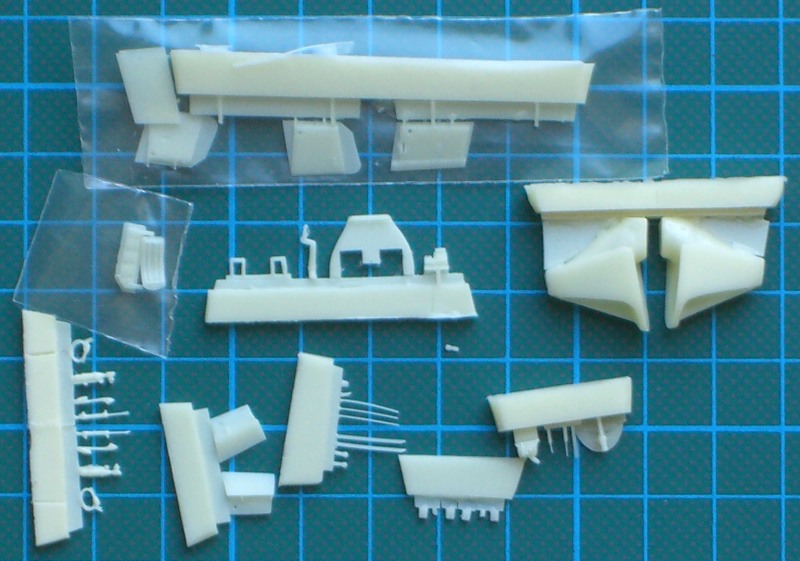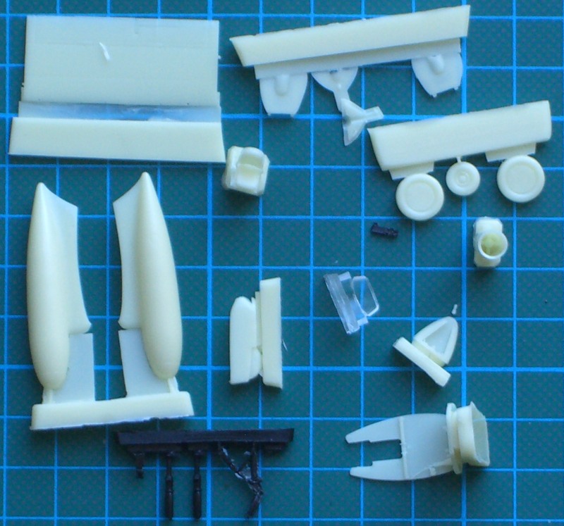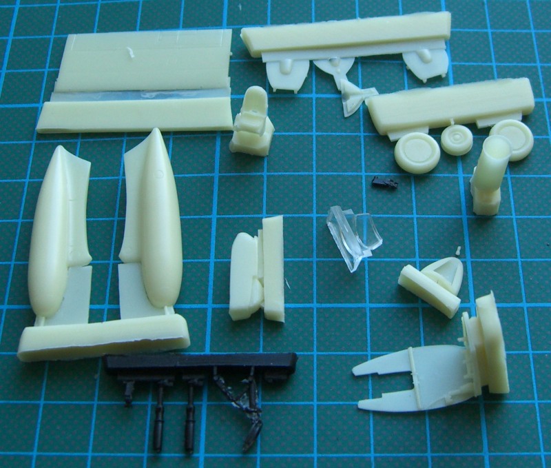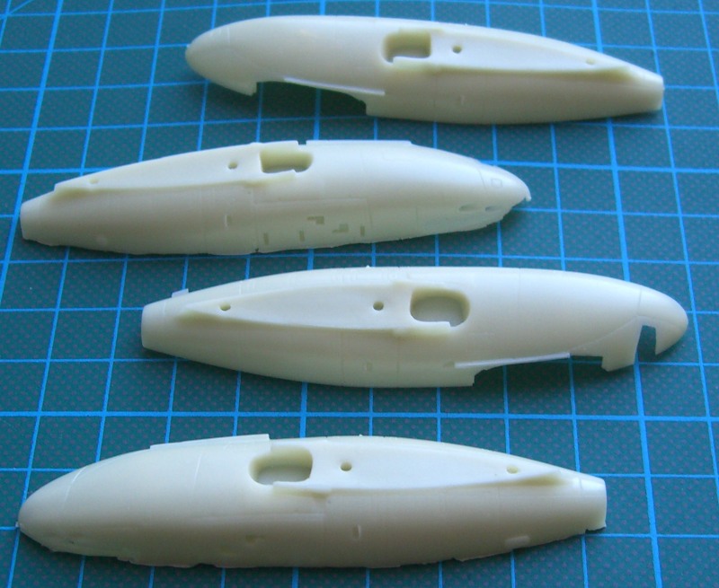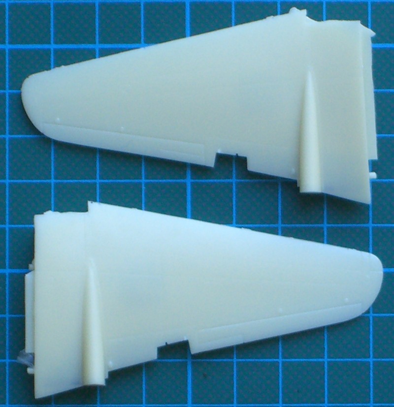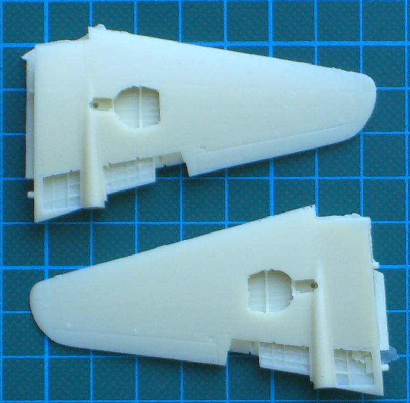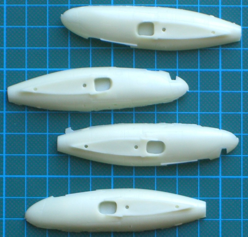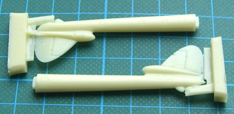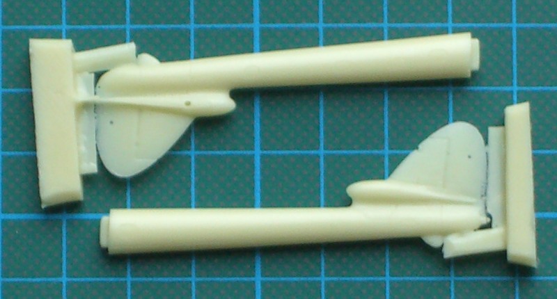 Es gibt jetzt zwei mal zwei Rumpfhälften, die im Cockpitbereich ordentliche Strukturen besitzen und eine zweiteilige Tragfläche, die dann stumpf an den Rumpf geklebt werden muss. Die beiden Ausleger für das Seiten- und Höhenleitwerk sind jeweils einteilig. Das gilt ebenso für das Höhenleitwerk. Die Vacukanzel liegt zum Glück wieder doppelt dabei.