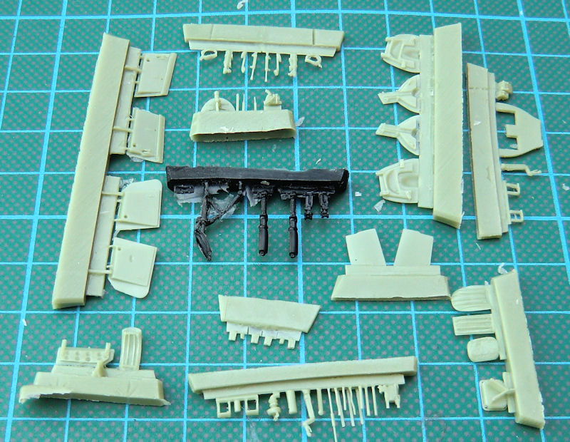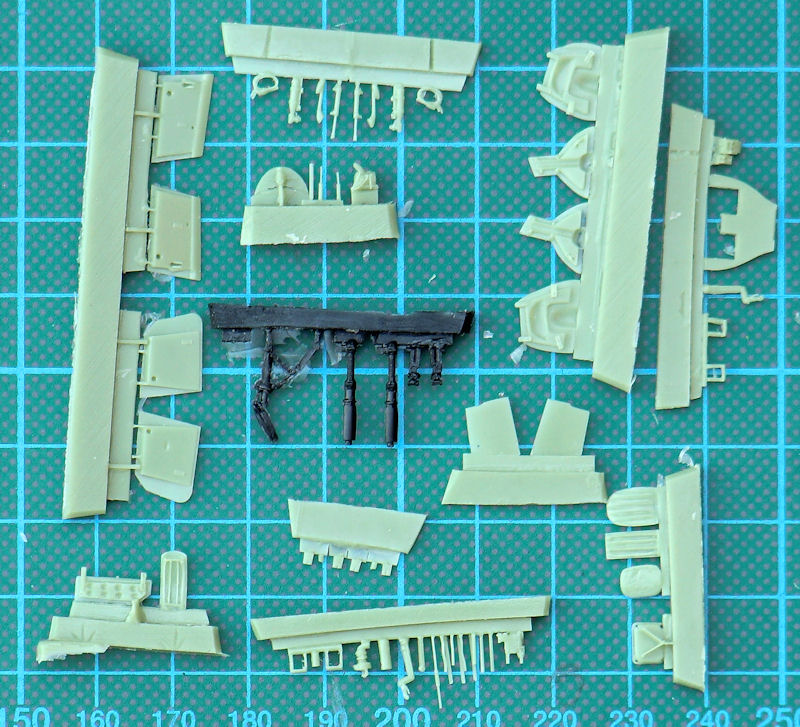 Bausatz: Im stabilen Stülpkarton befinden sich gut verpackt 73 Resinteile, ein Fotoätzteilbogen, zwei Vacukanzeln, gelbe Masken und ein Decalbogen. In meinem Karton waren noch ein paar Teile zusätzlich. Andere wandern in die Restekiste.