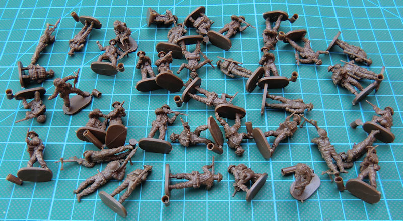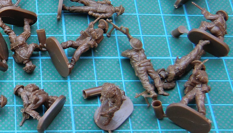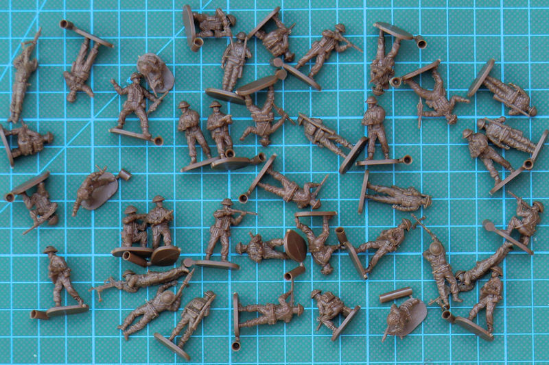 Caesar Miniatures aus Taiwan hat in den vergangenen Jahren eine Vielzahl von Figurensets zu verschiedenen Themen herausgebracht. Die attraktive und stabile Schüttbox enthält eine Tüte mit insgesamt 38 Figuren in acht verschiedenen Posen. Diese sind alle sehr gut gelungen und die Proportionen der Soldaten sowie der Faltenwurf der Bekleidung darf man als gelungen bezeichnen. Alle Figuren sind auf einen Grundplatte befestigt und das Material ist sehr hart. Leider sind einige Waffen an den Läufen leicht verformt. Das Problem dürfte sich mittels einem Bad im heißen Wasser beseitigen lassen.
