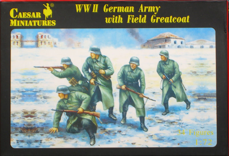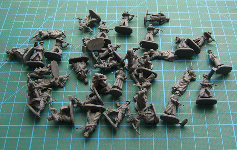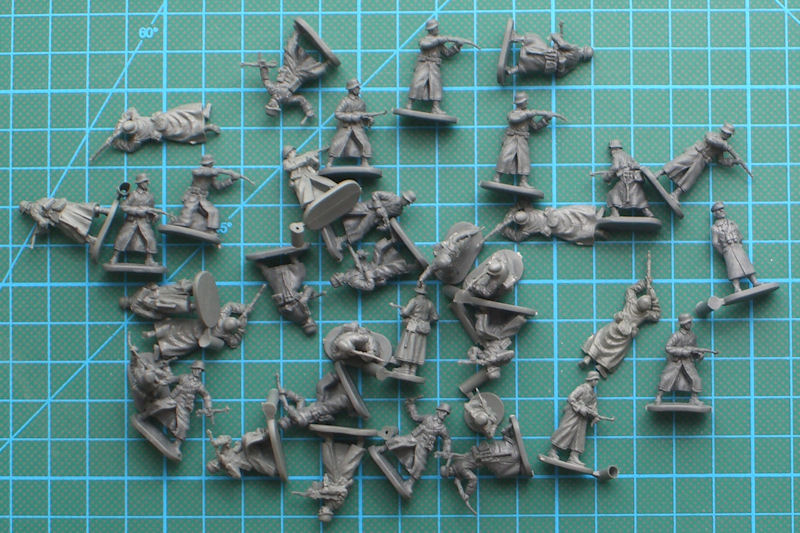 Caesar Miniatures aus Taiwan hat in den vergangenen Jahren eine Vielzahl von Figurensets zu verschiedenen Themen herausgebracht. Die attraktive und stabile Schüttbox enthält eine Tüte mit insgesamt 35 Figuren in acht verschiedenen Posen. Diese sind alle sehr gut gelungen und die Proportionen der Soldaten sowie der Faltenwurf der Bekleidung darf man als gelungen bezeichnen. Alle Figuren sind auf einen Grundplatte befestigt und das Material ist sehr hart. Leider sind einige Waffen an den Läufen leicht verformt. Das Problem dürfte sich mittels einem Bad im heißen Wasser beseitigen lassen.