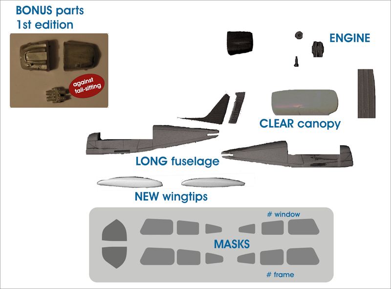 Die korrekte Fensterform des neuen Rumpfes nebst einem Resinklarsichteil für die Kabine wird durch Abklebemasken hergestellt. Diese enthalten auch noch welche für die weißen/silbrigen Umrandungen der Fenster - wirklich Klasse gemacht CONSTANZA!