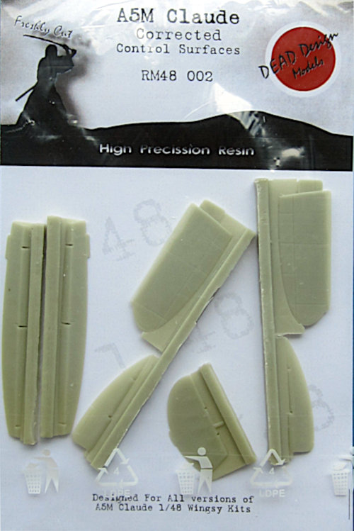 Für die Mitsubish A5M Claude Reihe von Wingsy Kits hat DEAD Design Models ein Set mit Steuerflächen herausgebracht. In der Tüte befinden sich sieben sauber gegossene Resinteile und eine kleine Bauanleitung. Die Höhenruder können im Bausatz nicht ausgelenkt dargestellt werden, daher hat DEAD Design hier sowohl Ruderfinnen wie auch Steuerflächen beigefügt. Achtung die Hohlkehle ist empflindlich und der kleine überstand sollte vorsichtig entfernt werden (siehe Bauanleitung). Die Querruder und das Seitenruder sind korrigiert und mit korrekter Stoffebespannung daregestellt. Die Bauteile sind für den Wingsy Kits Bausatz entworfen und passen vom Design zu diesem. Im Gegensatz zu Fine Molds gibt es hier eine Nietendarstellung!