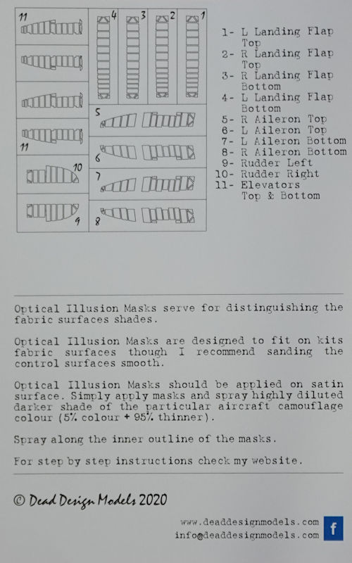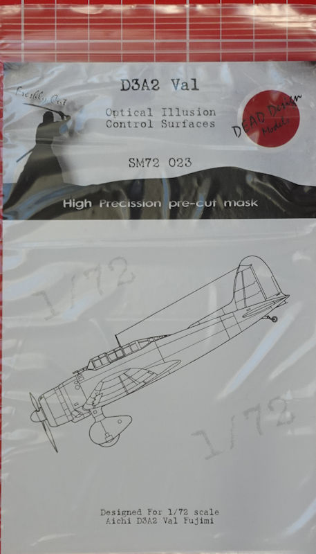 Für die verschiedenen Auflagen der Aichi D3A2 Val von Fujimi in 1/72 hat DEAD Design models ein Set mit sog. Optical Illusion Control Surface herausgebracht. Es enthält Vinylmasken und die Bauanleitung.
