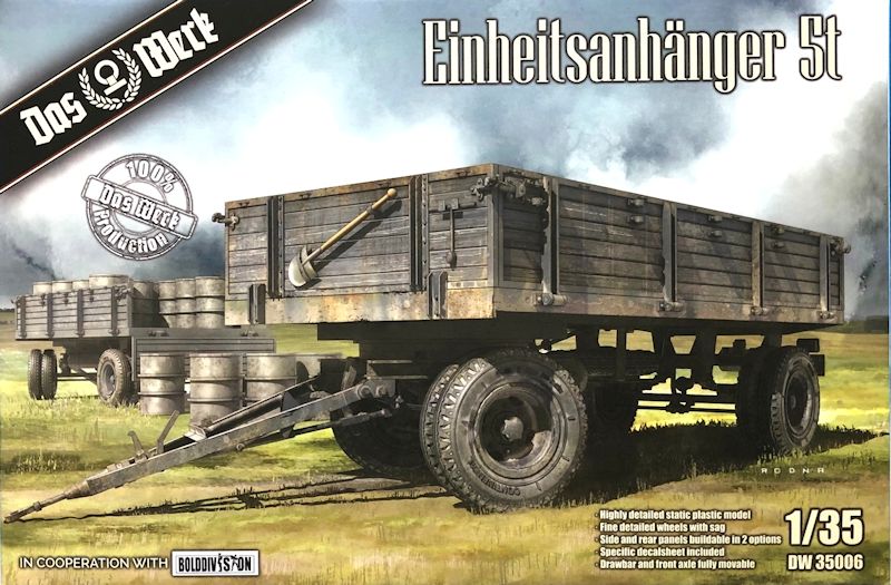 Bausatz: Mit großer Spannung wurde dieser neue Bausatz der Firma "Das Werk" erwartet, der bereits Anfang diesen Jahres bei der Nürnberger Spielwarenmesse vorgestellt wurde. Der Plastikbausatz des Einheitsanhängers 5t ist in diesem Fall das Resultat einer Kooperation von Sebastian Debold mit Modellbau König. Sebastian bietet bereits seit etlichen Jahren, unter dem eigenen Label Boldivision sehr interessante und schöne Resinbausätze in Kleinserie an. Darunter befand sich auch der Anhänger E5 als Resinbausatz, der wegen der in Echtholz beiliegenden Beplankung realistische Gestaltungsoptionen ermöglichte.
