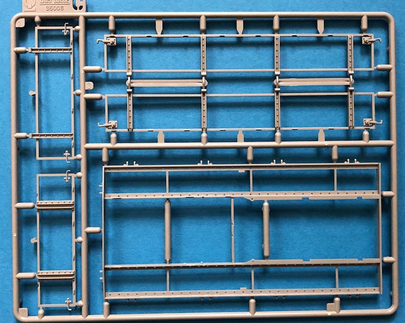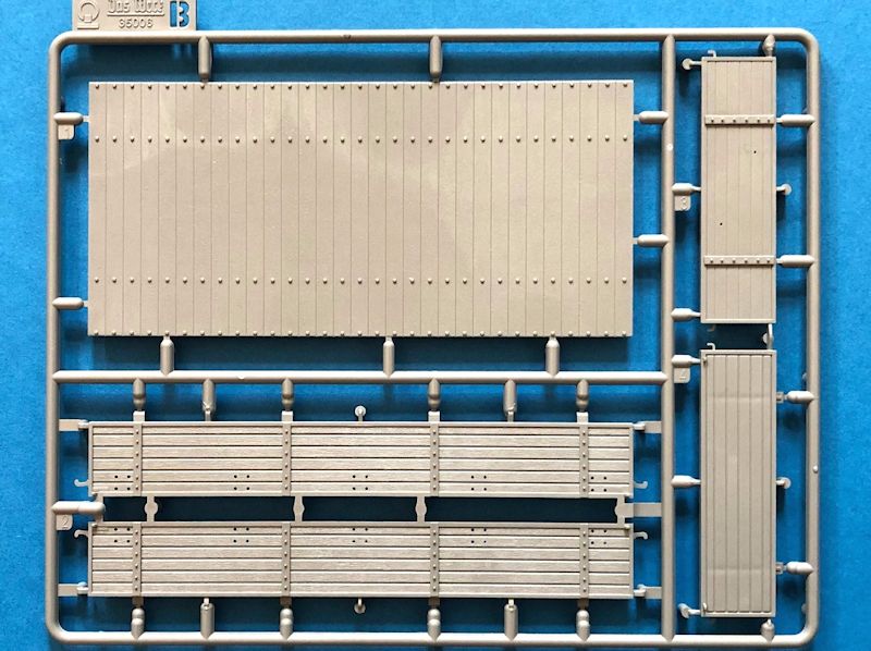 Der Grundrahmen für die Pritsche entspricht hinsichtlich Layout und Abmessungen perfekt mit dem Original überein. Nicht im Bauplan weiter erwähnt ist, dass man mit einem weiteren separat angebotenem Zurüstsatz die Beplankung des Ladebetts sowie den Seitenwänden mit gelaserten Echtholzteilen darstellen kann. Dafür liegen zusätzliche Teile wie die Metallrahmen der Seitenwände und diverse Nieten und Zusatzdetails bei, die man bei Nutzung der Plastikteile nicht benötigt.