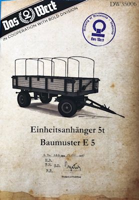 Vorbild: Der Einheitsanhänger 5t wurde im zweiten Weltkrieg vom Militär als mittlerer Standardanhänger genutzt. Unter der Bezeichnung Baumuster E5 wies dieser eine Ladekapazität von 5 Tonnen auf und hatte ein Leergewicht von knapp 2,5 Tonnen. Der Anhänger wurde von den Truppenteilen zum Transport von Material an allen Fronten eingesetzt und hat sich so gut bewährt, dass er auch nach dem zweiten Weltkrieg sowohl bei Fuhrbetrieben als auch in der Landwirtschaft noch lange im Einsatz blieb.