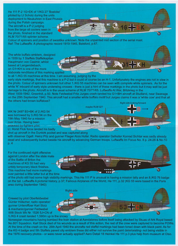 Manchmal gibt es schon Zubehör für Bausätze, die noch nicht auf dem Markt sind. Hier hat AIMS Revell überholt und liefert schon einen Decalsatz für die Heinkel He 111P-2, die erst im späten Frühjahr erscheinen soll. Dieser Decalsatz ist trotzdem sehr interessant, denn er enthält ein paar Markierungen, die Revell auf jeden Fall nicht bringen wird. Er enthält die speziellen Einheitsmarkierungen, ein paar Balkenkreuze und Markierungen(im Original) für das Seitenleitwerk. Dazu gibt es eine umfangreiche Bemalungsanleitung für mehrere Maschinen der deutschen Luftwaffe.