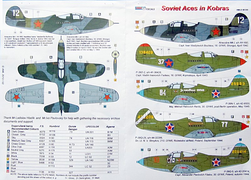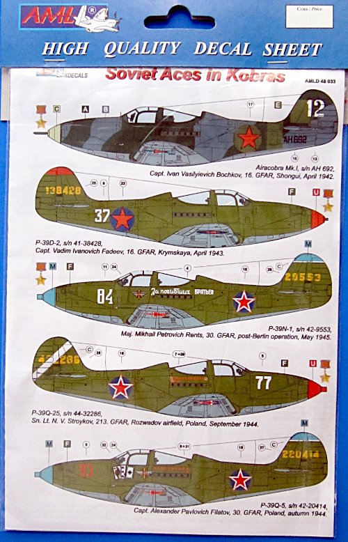Fazit: Die Aeracobra war in sowjetischen Diensten sehr erfolgreich, daher gibt es auch zahllose mögliche Markierungen für erfolgreiche Piloten auf der P-39. Hoffentlich setzt AML die Reihe fort! Der Druck ist sehr gut und die Verarbeitung der AML-Decals hat sich in der Vergangenheit als sehr einfach gezeigt, etwas Anderes ist hier auch nicht zu erwarten. Empfehlenswert!