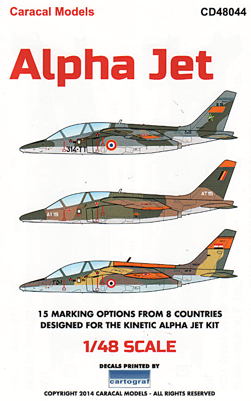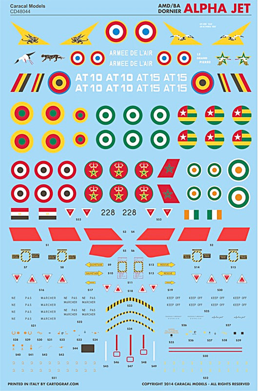 Für den Bausatz des Dornier Alpha Jet von Kinetic (First Look) hat die Firma Caracal mehrere Decalsätze heraus gebracht. Der Satz für die Patouille de France ist bereits vor einiger Zet erschienen. Nun ist endlich auch der Satz für die Internationalen Alpha Jets verfügbar. Hierin sind einige sehr interessante bzw. ungewöhnliche Bemalungen enthalten, unteranderem mein Favorit Togo.