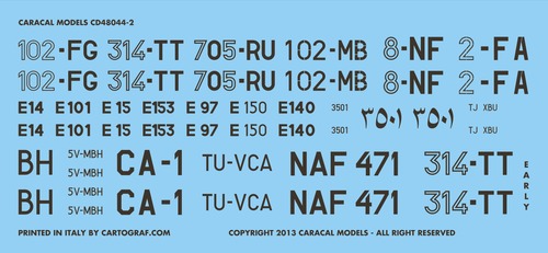 Insgesamt sind 15 - fünfzehn - Bemalungen möglich. Die Decals wurden bei Cartograf hervorragend gedruckt, so dass man sich über die Verarbeitung keine Gedanken machen muss. Wie so oft sind auch etliche Wartungshinweise und Walkways enthalten. Hier bekommt man wirklich was fürs Geld. Schön wäre es, wen diese auch separat erhältlich wären. Die Bemalungen sind farbig dargestellt, allerdings gibt es mit den Decals nur 9 Optionen. Für die restlichen 6 - die wirklich interessanten - soll man auf der Seite von Caracal Anleitungsblätter herunterladen können. Bisher sind aber noch nicht alle verfügbar...