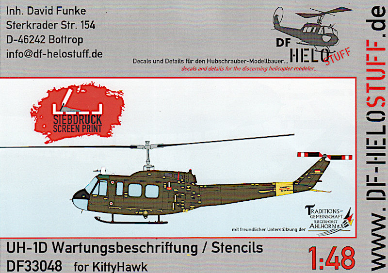 Mit diesem Satz können die Wartungsbeschriftungen am Modell von Kittyhawk (First Look) durch deutsche Wartungshinweise ersetzt werden, für Heer und Luftwaffe bis 1985 sowie für Bundesgrenzschutz und Katastrophenschutz. David Funke bietet auch diverse Abziehbilder für verschiedene deutsche Hueys an. Die Decals wurden im Siebdruckverfahren hergestellt. Bis auf die Gösch ist der Druck sehr gut. Beim Hoheitszeichen sind allerdings alle Farben leicht gegeneinander verschoben und rechts etwas ausgefranst. Trotzdem: für ein Kleinserienprodukt ist dies ausgezeichnet. Die Anleitung ist farbig gedruckt und zeigt den UH-1D von rechts, links, und oben. Die Leitwerksbeschriftungen werden für drei Nutzer exemplarisch gezeigt.
