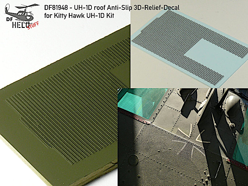 Bei diesem Satz wurde ein Gießkunststoff auf das Trägermaterial gedruckt, so dass der typische Antirutschbelag des Hubschrauberdaches am Modell von Kittyhawk (First Look) nachgebildet werden kann. Das dreidimensionale Ergebnis lässt sich im Bild nur schwer darstellen, daher nehme ich mal das Produktbild von DF zu Hilfe. Die Anleitung verweis lediglich darauf, dass Decal auszuschneiden. Ansonsten dürfte die Verwendung analog normaler Abziehbilder verlaufen. Es ist allerdings unklar, wie steif das Decal ist und ob man es mit Weichmacher behandeln darf/kann/muss...