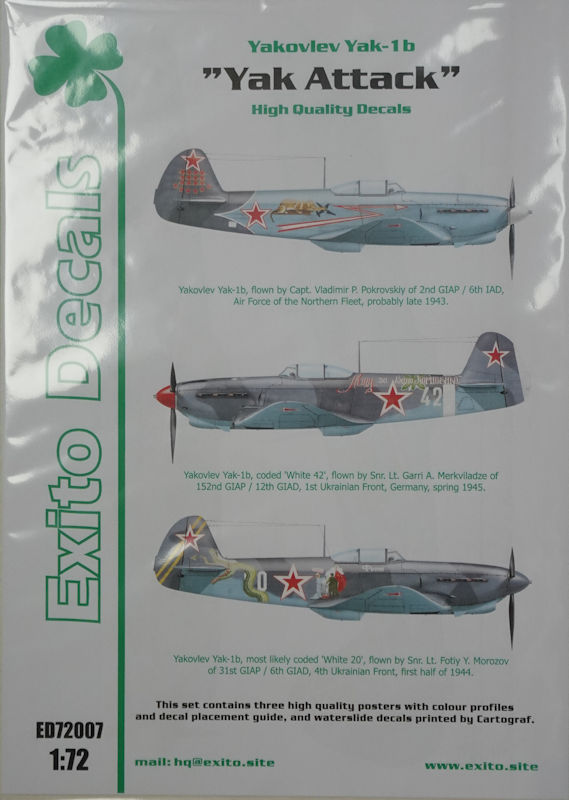 Der noch relativ neue polnische Anbieter Exito Decals bietet hier für drei Jakowlew Jak-1b Decals im Maßstab 1/72 an. Gedruckt wurden die Decals auf hellblauem Hintergrund von Cartograf. Diese sind dünn und hochglänzend und die Schärfe sowie die Farbdichte sind hervorragend. Wartungshinweise gibt es keine.