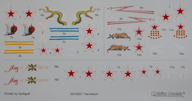 Fazit: Hier werden hohe Qualität und interessante Vorbilder geboten für alle Jakowlew Jak-1b -Interessierten, die mit dem Gebotenen bei Arma Hobby oder Brengun nicht zufrieden sind. Sehr empfehlenswert! Der gleiche Bogen wird von Exito übrigens auch in 1:48 angeboten.