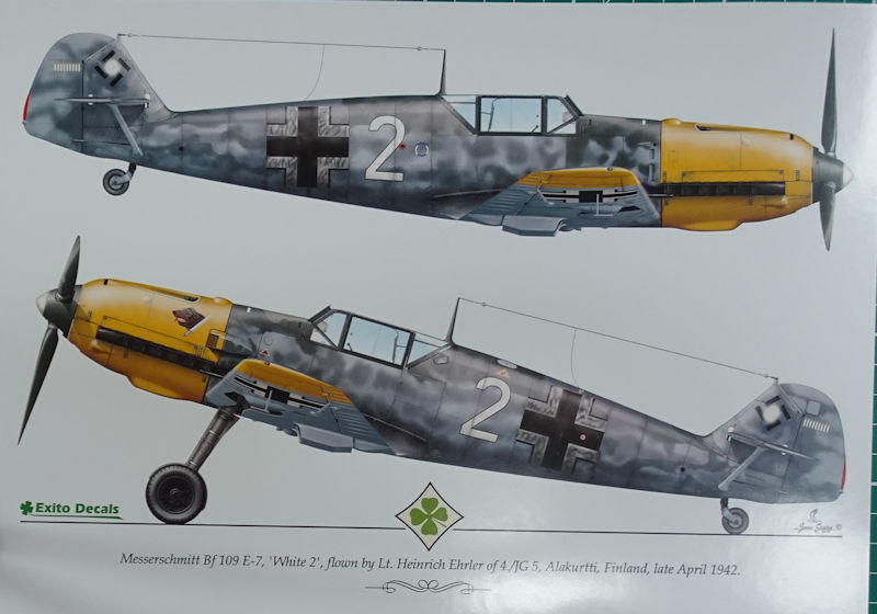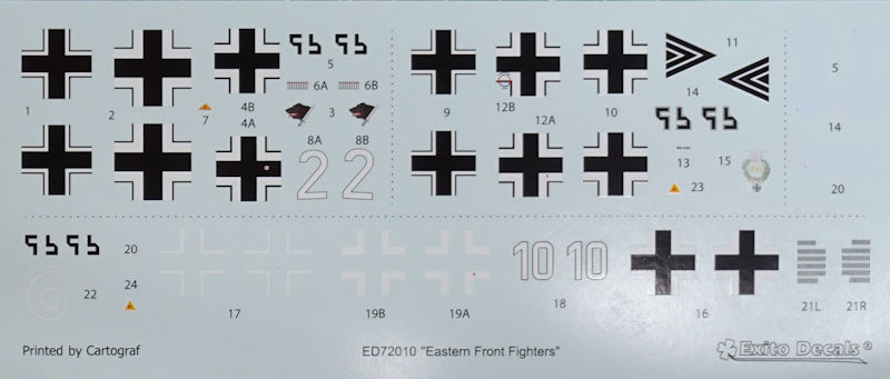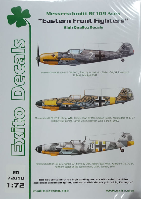 Der noch relativ neue polnische Anbieter Exito Decals bietet hier für drei Messerschmitt Bf 109 unterschiedlicher Varianten Decals im Maßstab 1/72 an. Gedruckt wurden die Decals auf hellblauem Hintergrund von Cartograf. Diese sind dünn und hochglänzend und die Schärfe sowie die Farbdichte sind hervorragend. Wartungshinweise gibt es keine.