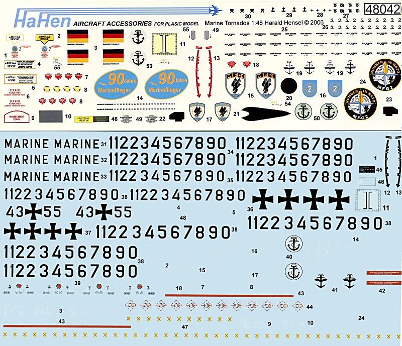 Harald Hensel (HaHen Aircraft Accessoires) hat eine Reihe neuer Decals herausgebracht. Hier sei das 1/48 Decal für die Marineflieger Tornados vorgestellt. Das umfangreiche Abzeihbild , einschließlich Sonderzeichen, lässt den Bau jeder bei der Marine geflogenen Maschine zu. Endlich liegen auch Markierungsmöglichkeiten für die attraktiven Grau - Weißen Maschinen vor. Fehlt nur noch ein zeitgemäßer Bausatz (bitte, liebe Vorstandsetage bei Revell ...).