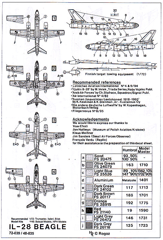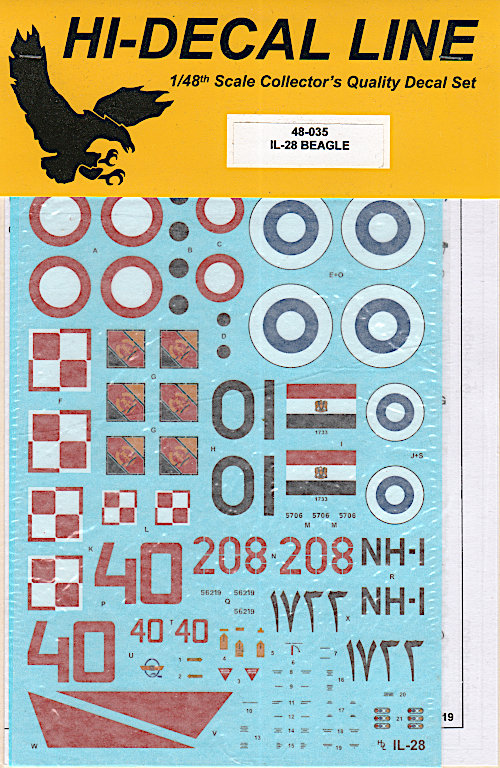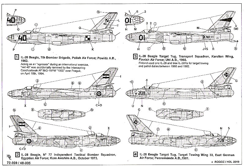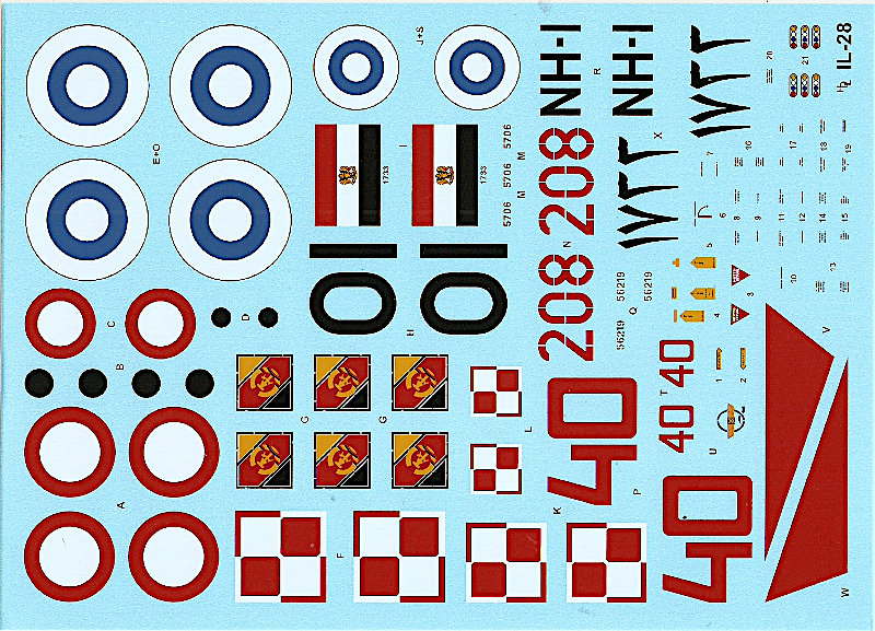 Dieser Satz enthält Markierungen für 4 internationale Iljuschin Il-28 Beagle. Mit dem Bausatz von Bobcat steht dem Modellbauer seit kurzem eine gute Repräsentation des Vorbilds zur Verfügung, so dass diese besonderen Markierungsoptionen sehr willkommen sind.
