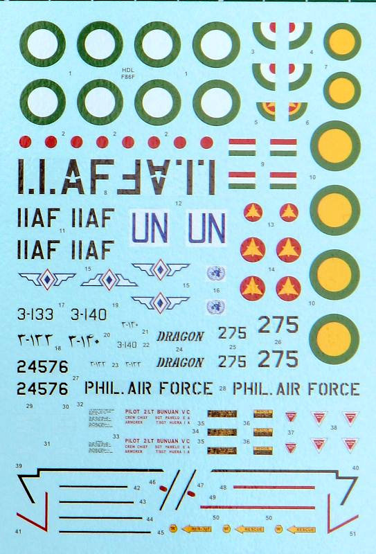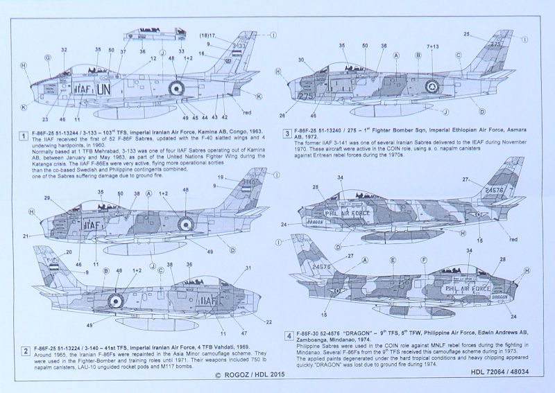 Für die verschiedenen Bausätze der N.A. F-86F Sabre von Fujimi, Hasegawa oder HobbyBoss gibt es einen interessanten Decalsatz. Der Druck des Decalbogens ist ohne Fehl und Tadel auf hellblauem Trägerpapier ausgeführt. Dazu gibt es ein beidseitig bedrucktes A4-Blatt als Bemalungshinweise. Es gibt es Decals für vier F-86F-25/30 mitsamt einiger Wartungshinweise. Die Bemalungshinweise enthalten Farbangaben für Federal Standard, Humbrol und Model Master.