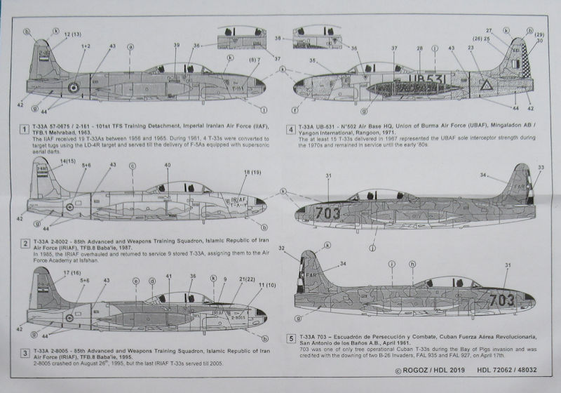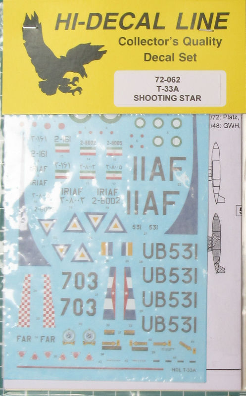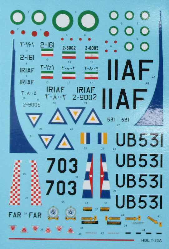 Dieser Decalsatz enthält Markierungen für fünf internationale Lockheed T-33A. Mit dem Bausatz von PLATZ steht dem Modellbauer zeitgemäßer Kit in 1/72 zur Verfügung, so dass diese besonderen Markierungsoptionen sehr willkommen sind. Ich finde immer das Thema Iranische Luftwaffe sehr interessant und dazu gehört vor allem die der Islamischen Republik.