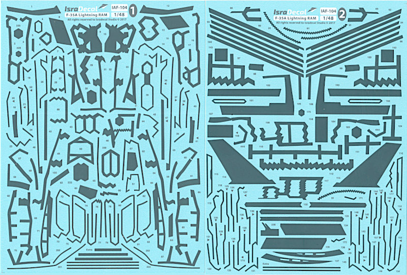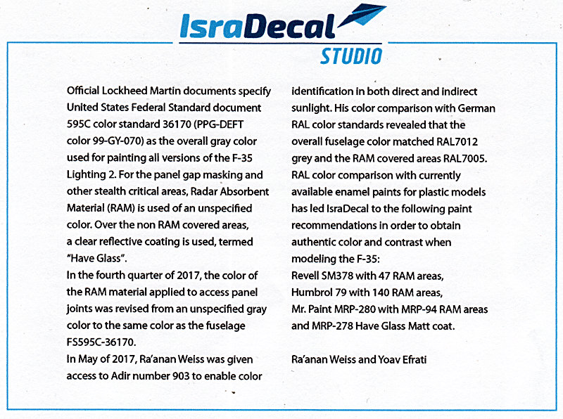 Habe ich mich beim Satz für die israelischen F-35 I noch über den Umfang beschwert, kann man hier nur sagen: WOW. Zwei A5 große Bögen enthalten fast alle Markierungen der RAM-Flächen der F-35. Dazu gibt es noch ein Blatt mit Informationen von Ra'anan Weisz und Yoav Efrati zur Farbanalyse und Darstellung mittels Modellfarben, denn Radom und die Flächen vor den Lufteinläufen sind zu lackieren. Ich bin gespannt, ob das Have Glass Finish von MRP auch noch unter weiteren Schichten Klear und Mattlack funktioniert, denn die RAM-Bereiche haben dieses Finish nicht und müssen daher nach der Lackierung der Grundfarbe aufgebracht werden.