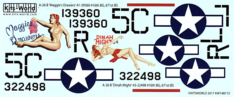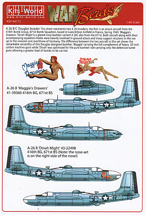Für die wiederaufgelegte Douglas A-26B von Revell Monogram suchte ich nach einer besseren Bemalungsvariante als "Stinky". Bei Kits World wurde ich fündig. In der Reihe War Birds ist dieser Satz erschienen, der zwei A-26B enthielt: eine frühe mit Waffenbug (6 MG's wie im Bausatz) und eine Bomberversion mit Glasbug