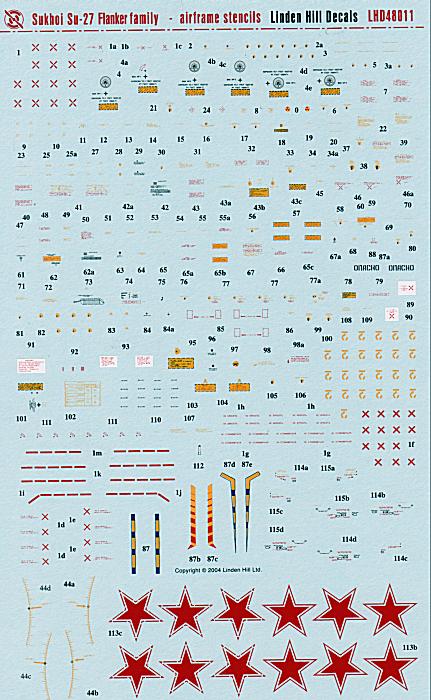 Der Abziehbildsatz enthält keine Wartungshinweise, doch auch dafür hat Linden Hill gesorgt und einen eigenen Satz herausgebracht. Dieser enthält eine Vielzahl (!!!!!) kleiner und kleinster Abziehbilder, die zum Teil verschiedene Varianten bestimmter Markierungen darstellen. Da die Su-27 bekanntermaßen ein großes Flugzeug ist, konnte natürlich nur Markierungen für ein Modell auf dem Bogen untergebracht werden.
