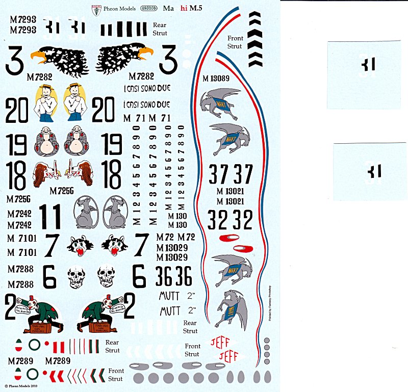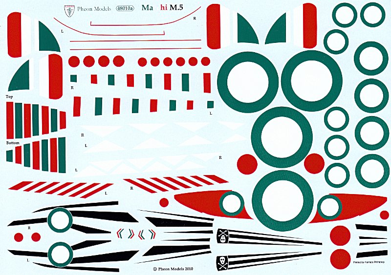 Dieser Satz ist mitte 2010 erschienen und ursprünglich für Fly's Macchi M.5 gedacht, aber bereits vorausschauen auch für den Bausatz von Blue Max (der gegen Ende des Jahres erschien). Die Ausstattung ist wieder sehr umfangreich. Neben den Abziehbildern, Bemalungsschemata auf Fotopapier und einem Überblick über das Modellangebot in 1/48 gibt es Korrekturhinweise für den Bausatz von Fly, recht ausführliche Informationen zum Flugzeugtyp allgemein (gekürzt in der Besprechung des Blue Max Bausatzes) und auch zu jeder einzelnen Bemalungsoption. Literaturhinweise sind natürlich auch enthalten.