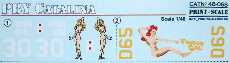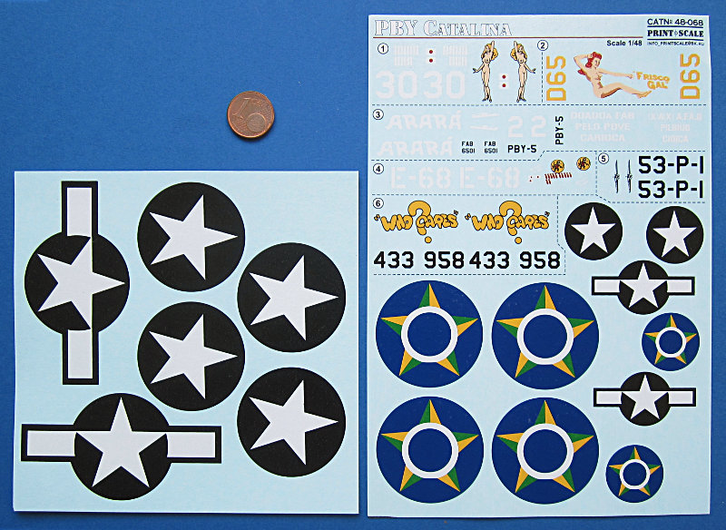 Für den Revell/Monogram Bausatz (bzw. Bausätze) der PBY Catalina hat Print Scale diesen Decalbogen herausgebracht. Er erlaubt die Darstellung verschiedener PBYs aus dem zweiten Weltkrieg mit zum Teil recht bunten Markierungen.