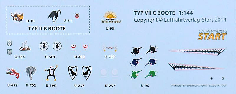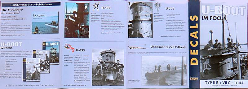 Der Luftfahrtverlag Start ist bekanntlich auch Herausgeber der Reihe U-Boot im Focus. Nun erschien ein Decalsatz im Maßstab 1/144. In dem sind diverse U-Boot-Bausätze erhältlich.