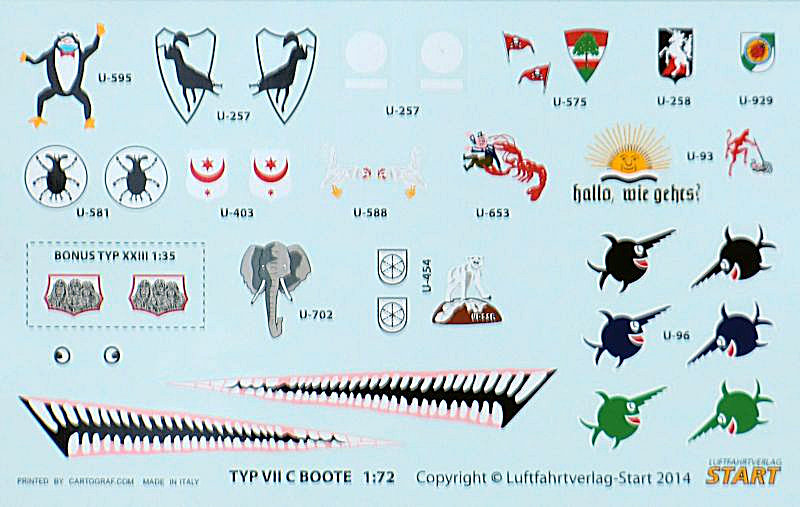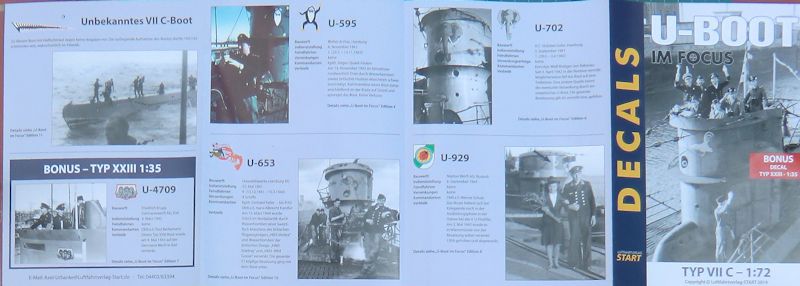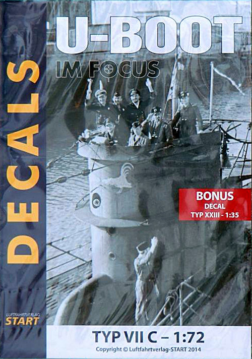 Der Luftfahrtverlag Start ist bekanntlich auch Herausgeber der Reihe U-Boot im Focus. Nun erschien ein Decalsatz für Typ VIIC-U-Boote im Maßstab 1/72. In diesem sind diverse U-Boot-Bausätze erhältlich. Eine Dekorationsmöglichkeit ist für ein Typ XXIII-Boot im Maßstab 1/35.