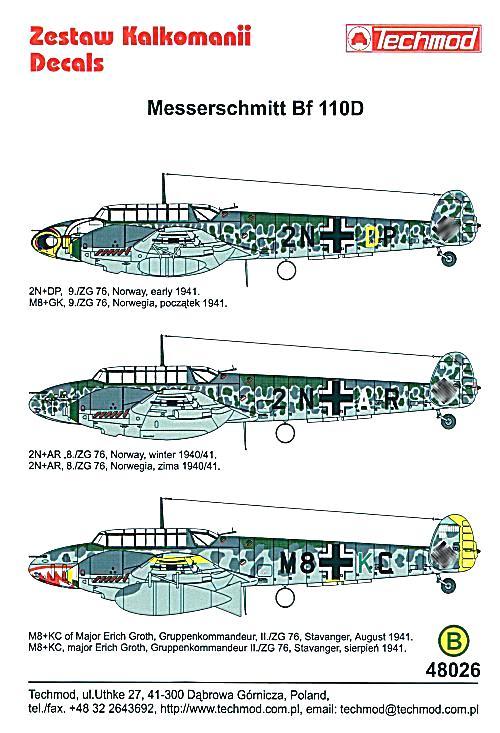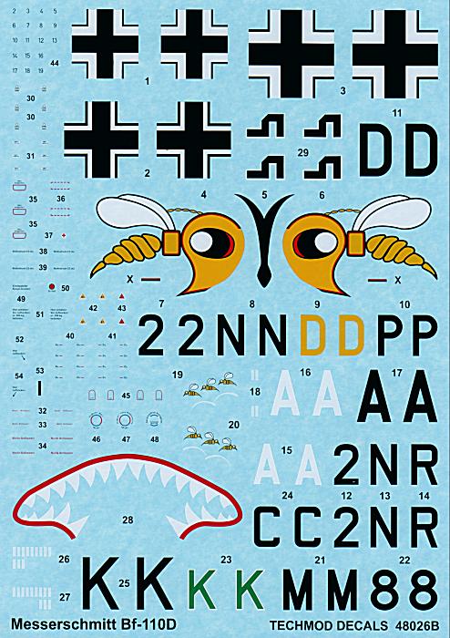 Decals Dieser Decal-Satz von Techmod ist schon etwas älteren Datums und für das ziemlich alte Fujimi Modell gedacht, die (derzeit) einzig mögliche Basis für eine frühe Bf 110 im Maßstab 1/48. Das Modell ist jedoch glücklicher Weise recht brauchbar, mal abgesehen vom nicht mehr zeitgemäßen Cockpit und den etwas unförmigen Auspuffstutzen. Für diese kleinen Schönheitsfehler gibt es jedoch das eine oder andere Pflaster auf dem Zubehörmarkt.
