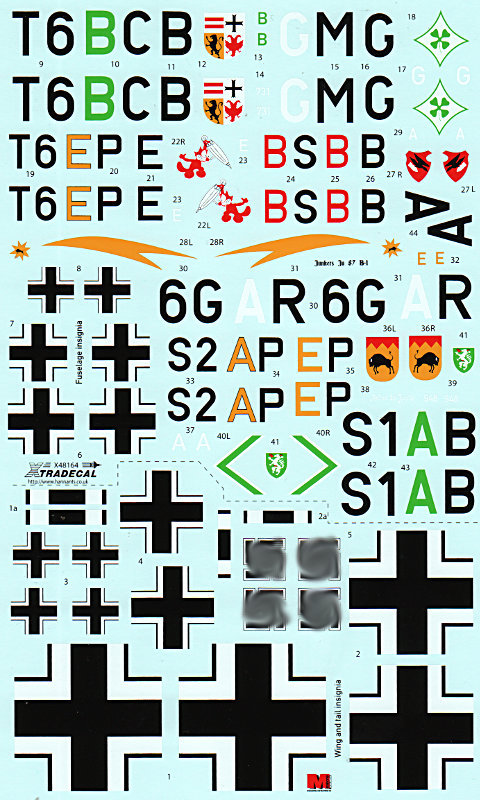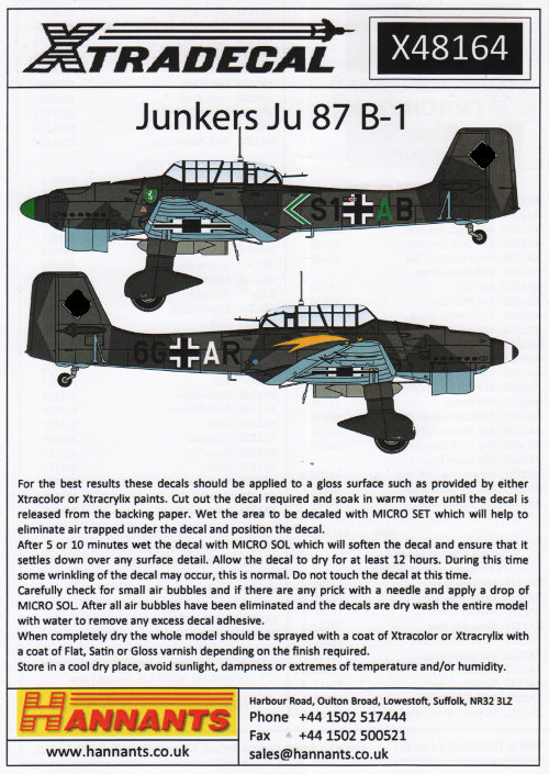 Schon vor Erscheinen des Bausatzes hat Hannants in der Produktlinie Xtradecal für Airfix' neue Junkers Ju 87B-1 (First Look) einen Decalbogen herausgebracht. Natürlich stimmt sich Hannants mit Airfix ab, so dass es nur in Ausnahmefällen zu Doppelungen mit dem Bausatz kommt. Das ist hier der Fall, jedoch ist der Schriftstil ein anderer. Da bei allen Bemalungsvarianten (Foto-)Quellen angegeben sind, kann man dies leicht überprüfen. Die Farben grün und rot sind mir bei Xtracolor etwas zu grell, aber das gibt sich vielleicht nach dem Aufbringen etwas.