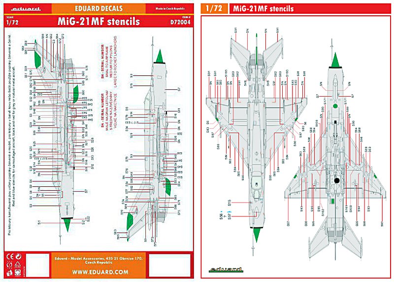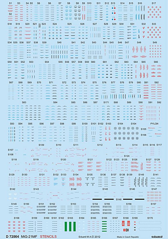 Nach Begemots Set für alle MiG-21 Versionen legt Eduard mit mehreren typenbezogenen Decalbogen nach. Dieser ist die 1/72 Ausgabe des im MiG-21MF Profipack (1/48) enthaltenen Decalbogens. Neben den Wartungs- und Sicherheitshinweisen für die Zelle enthält er auch die Kennzeichnungen für die Waffenträger und Waffen. Leider hat beim Verkleinern die Lesbarkeit etwas gelitten, man sollte es aber tolerieren. Über den Sinn einer Komplettbestückung bei Einsatzmaschinen kann man nach wie vor vortrefflich streiten.