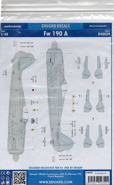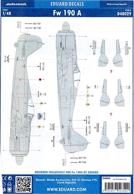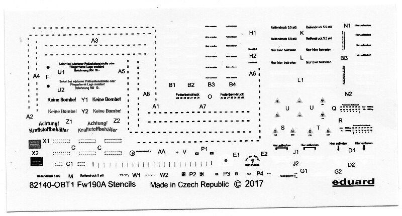 Eduard bietet die in seinem neuen Fw 190 A-4-Kit enthaltenen Wartungshinweise nun auch separat an. Der kleine hellblaue Bogen aus eigener Produktion bietet neben lesbaren Wartungshinweisen und Walkways in schwarz und rot Oktandreiecke, einige Schilder, die ebenfalls problemlos mit der Lupe lesbar sind und Beschriftungen für Abwurftanks und Bomben. Das Gelb und das Rot sind leuchtend und der Druck zeigt keinen Versatz.