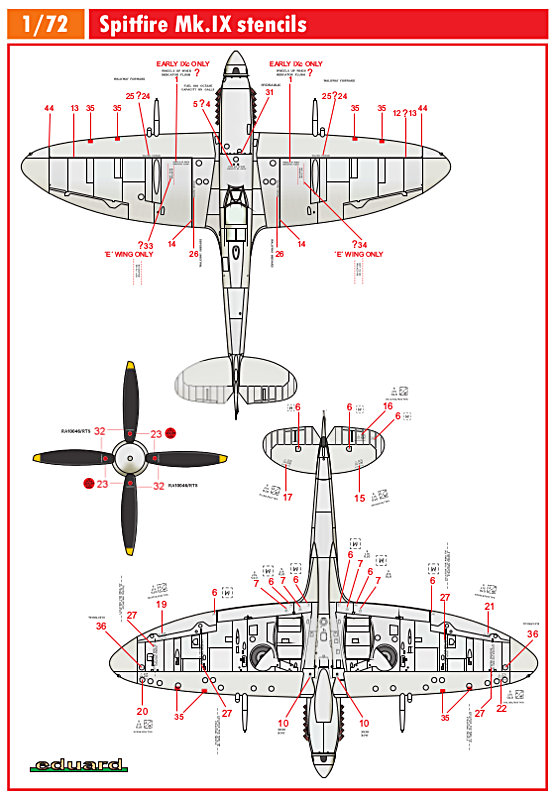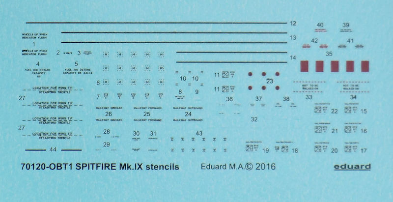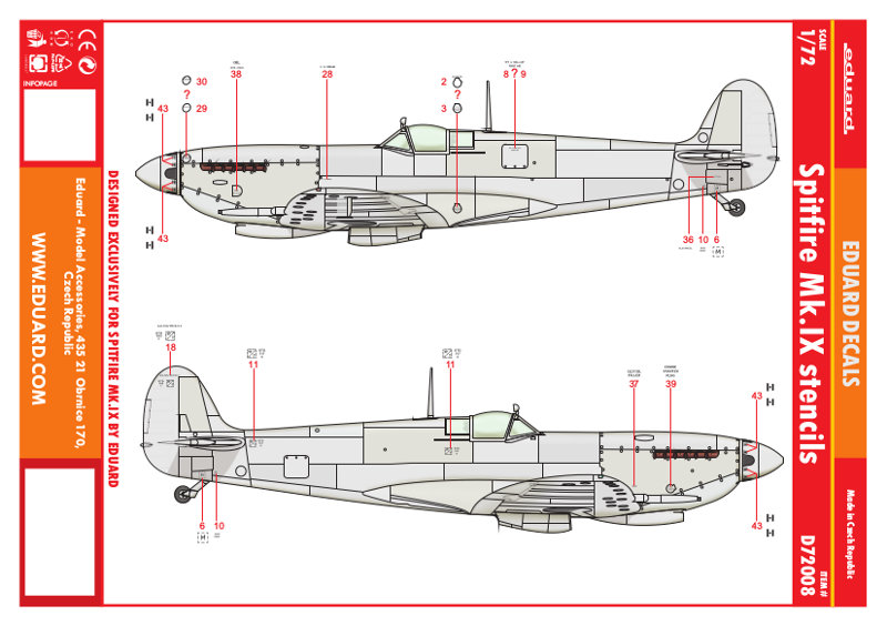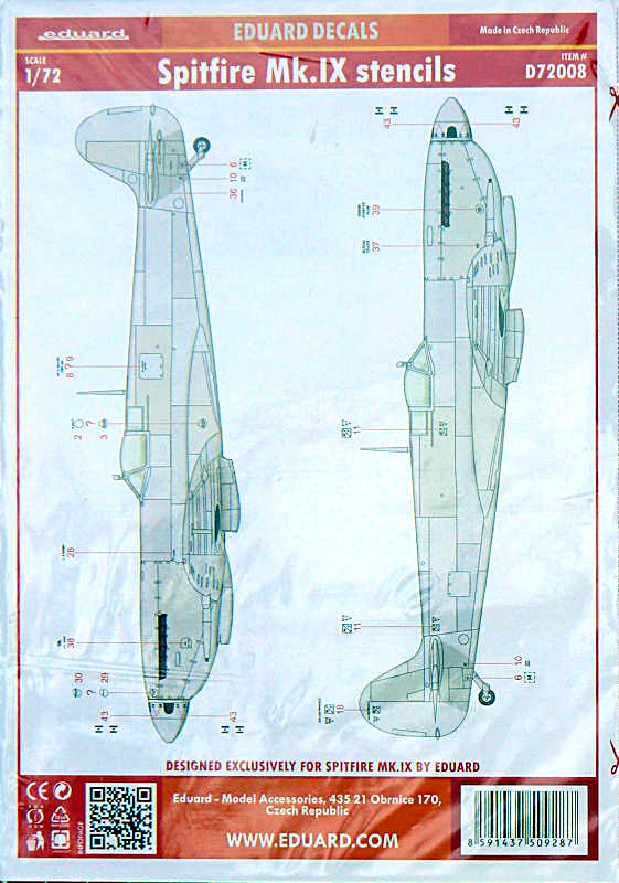 Für die verschiedenen Bausätze der Supermarine Spitfire Mk. IX in 1/72 hat eduard selbst einen Decalsatz mit Wartungshinweisen herausgebracht.