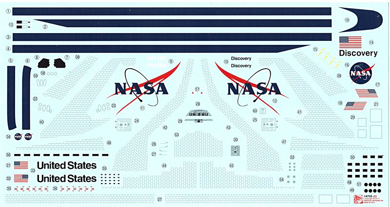 Der Decalbogen ist matt gedruckt und enthält die Markierungsoption für das Shuttle Discovery und die 747 der NASA mit dem Kennzeichen N911NA. Leider sind nur die grundsätzlichen Elemente enthalten, Wartungshinweise oder auch die auffällige Kachelstruktur für die Unterseite des Shuttle als Decal sucht man vergebens. Viel Aufwand ist beim Aufbringen der blauen Cheatline am Jumbo zu erwarten, da jedes Fenster einzeln zu öffnen ist. Silverframes oder Fenster als Abziehbild sind nicht vorhanden.