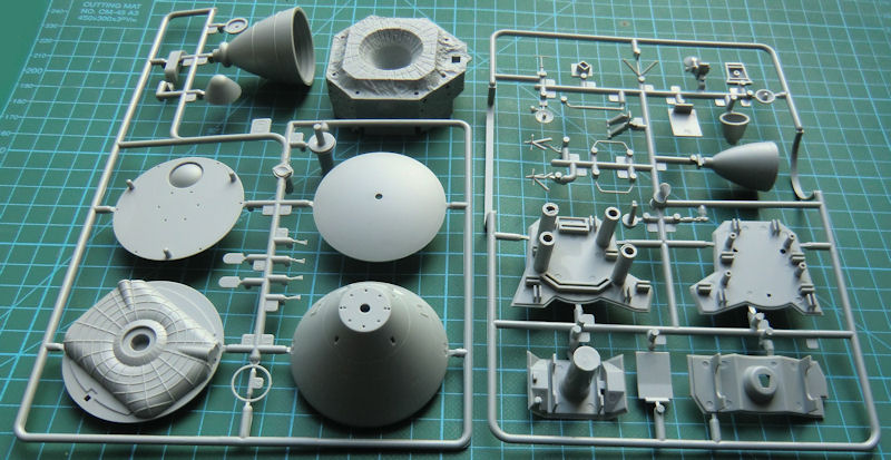 Das eigentliche Raumschiff ist nur von außen detailliert. Das macht auch Sinn. Hier kommen auch die vier Antennen aus Fotoätzteilen zum Einsatz. Mit einem Ständer können beide fertigen Teile zusammen ausgestellt werden. Das ist eine gute Idee..