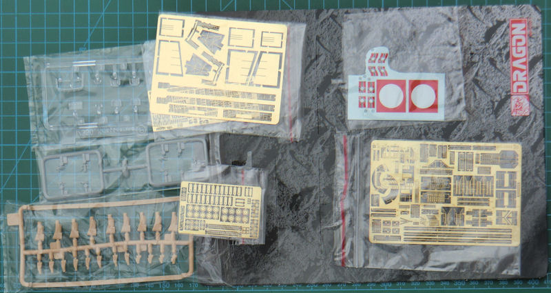 Dem Bausatz liegen auch mehrere Fotoätzteilplatinen bei. Die Teile dienen insbesondere zur Detaillierung der Funkmeßgeräte, der Darstellung von Leitern sowie der Reling. Interessant sind auch ein paar Figuren aus Metall. Mittels Farbe lassen sie sich plastischer bemalen. Ein paar Decals gibt es auch. Leider hat sie Dragon nicht für den deutschen Markt gesetzeskonform hergestellt. Ansonsten sind sie tadellos auf hellblauem Trägerpapier gedruckt.