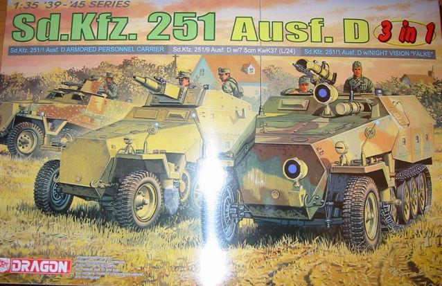 Mit dem vorliegenden Sd.Kfz.251 Ausf.D 3in1 bringt die Fa. DRAGON eine neue Bausatzreihe auf den hiesigen Modellbaumarkt. Es können aus einem Grundbausatz eine der drei verschiedene Versionen erstellt werden: