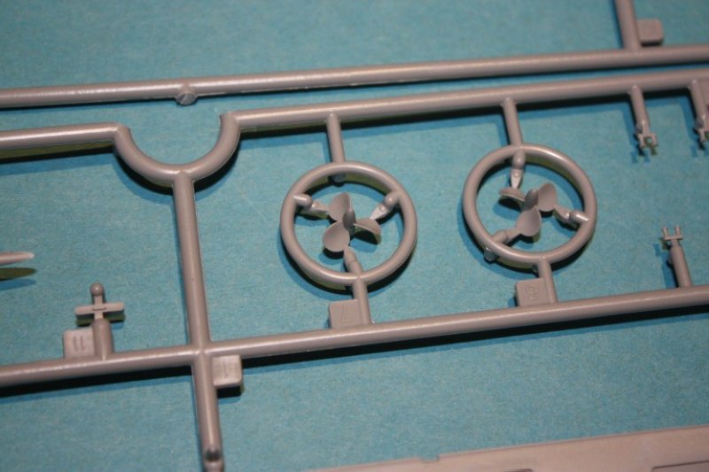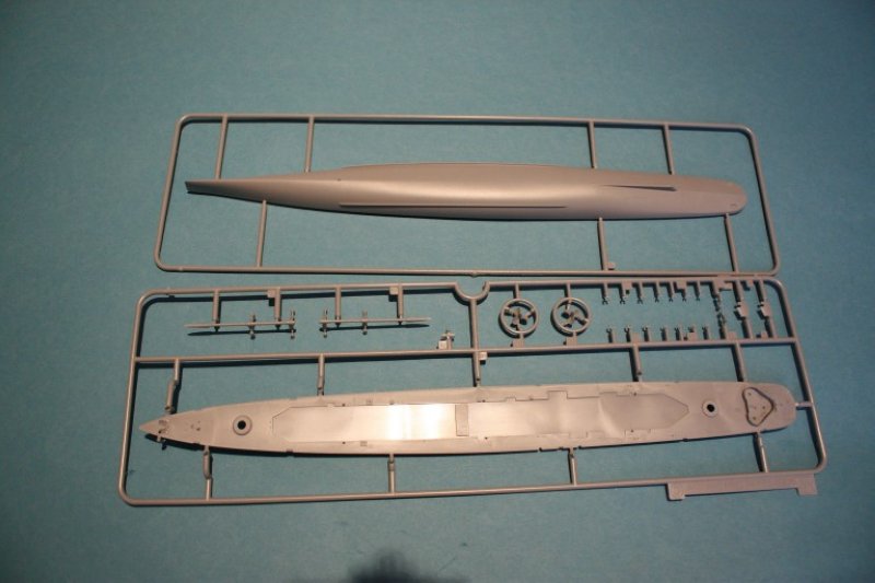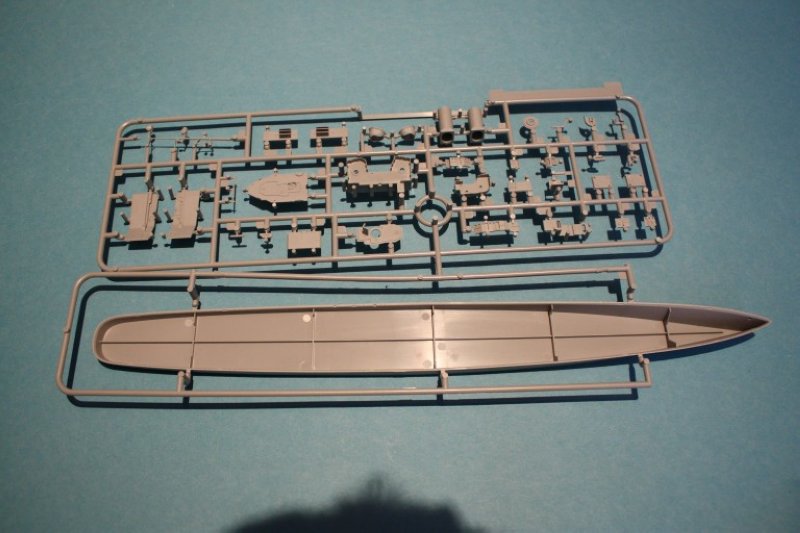 Der Rumpf ist an der Wasserlinie geteilt und bietet somit ohne großen Aufwand die Möglichkeit der Darstellung in Vollrumpf oder Wasserline. Für die Vollrumpfoption liegt selbstverständlich ein Unterwasserschiff samt Ruder, Wellen mit Hosen und Schrauben bei. Diese sind übrigens mit realistischer Steigung und dünnen Blättern versehen. Für die Präsentation der fertigen Modelles in dieser Form liegt ein recht schöner Ständer samt Füßen bei.