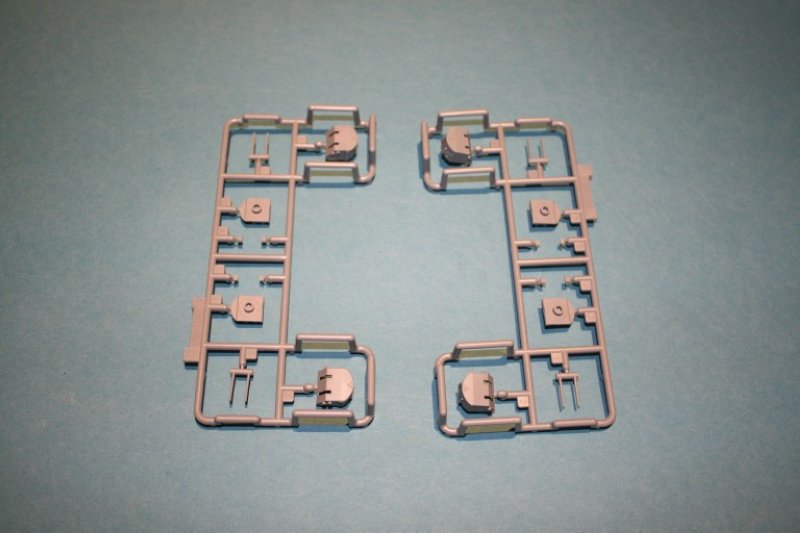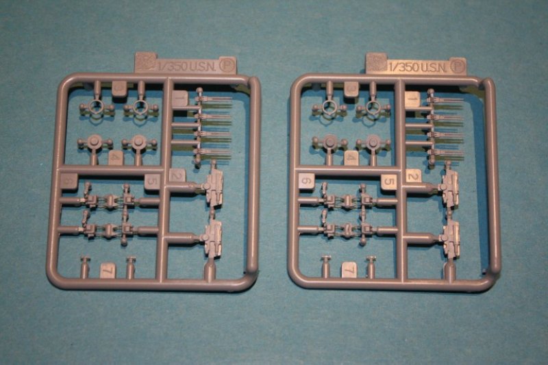 Besonderes Interesse gilt natürlich der Bewaffnung bzw. deren Darstellung im Modell. Die 5" Doppeltürme haben ein einteiliges Gehäuse und sind hervorragend detailiert mit Leitern, Richtoptiken, Türen und der Haube für den Turmkapitän. Die Rohre sind als Paar ausgelegt und beliebig in der Erhöhung verbaubar. Die Mündungen der Geschütze sind offen! Allerdings sind auch keine Geschützbalge für den Schutz gegen Seewasser vorhanden. Hier muss man prüfen, ob sein Schiff solche montiert hatte. Die 40mm Bofors sind als Zwillings- oder Vierlingslafetten vorhanden.