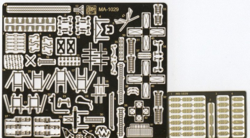 Die dem Kit beiliegenden Ätzteile bieten Teile für die Radare, Stützen für Wannen, Gestelle für Rettungsschlauchboote, Details für die Geschütze, Ankerketten, Leitern und Treppen und den Schraubenschutz. Zum Biegen selbigen gibt es eine Lehre aus Plastik, genial einfach. Desweiteren sind 38 Türen in verschiedenen Varianten vorhanden, mit Details beidseitig versteht sich. Einzig eine Reling fehlt, hier sollte man dann noch einen der auf den Markt befindlich Sätze sich zulegen.