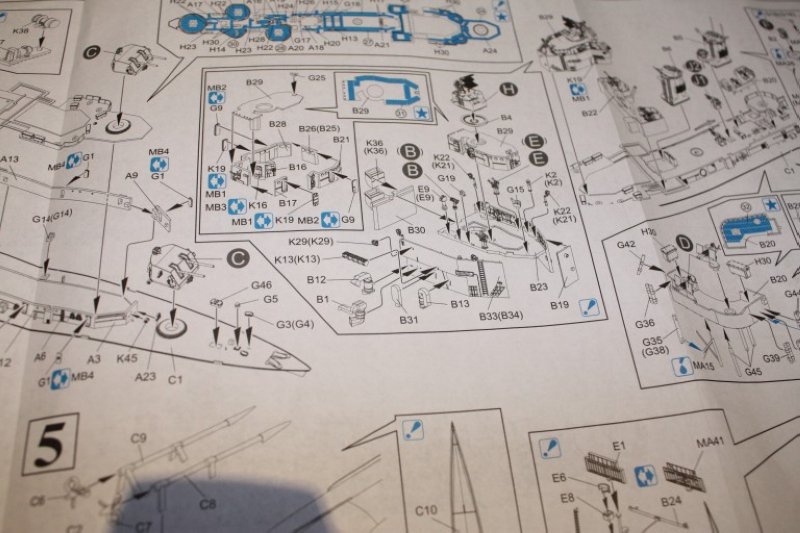 Kommen wir nun noch zur Bauanleitung, diese fällt ehrlich gesagt für ein Modell dieser Größe etwas klein aus. Auf A5-Größe gedruckt werden in 8 Bauschritten die Teile verbaut. Hier muss man wirklich schon ganz genau hinschauen bei gefühlten 50 Teilen pro Schritt. Ein paar Schritte mehr hätten sicherlich nicht geschadet. Die Bemalung zeigt die Gearing in einem Ms.22 Schema, allerdings erwähnt Terzibaschitsch in seinem Buch, das die im Bausatz zu bauende Variante mit dem dritten Boforsvierling, der den achteren Torpedosatz ersetzte, ein Ms. 33/28d Dazzle Schema trug. Dies gilt es noch zu überprüfen.