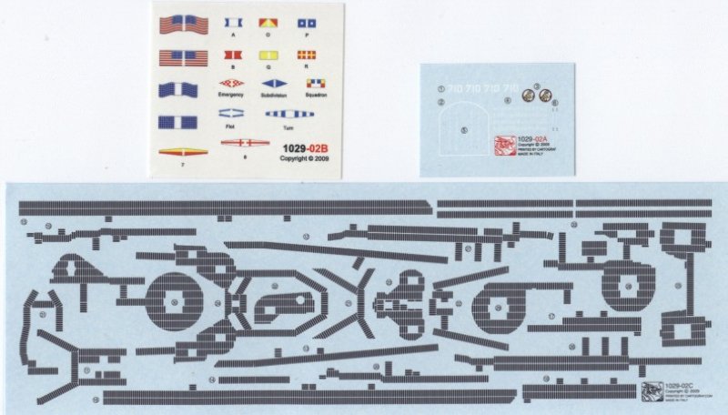 Der Decalbogen bietet in einer perfekten Aufmachung die Walkways, selbstverständlich auch für die Oberdecks, passend für jede Position. Desweiteren sind auf einen zweiten Bogen Kennnumern, Wappen für die USS Gearing sowie Eintauchtiefenangaben vorhanden. Ergänzt wird das ganze durch einen Flaggensatz auf Papier, die Hoheitsflagge korrekt mit 48 Sternen.
