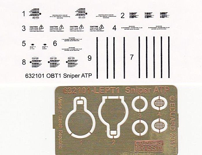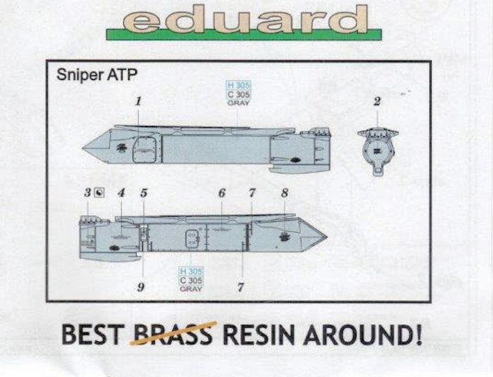 Fazit: Nachdem der Sniper ATP Pod von Eduard aus der Brassin Serie schon im Maßstab 1/48 erschienen ist, kann man sich auch im Maßstab 1/32 an diesem Zubehör erfreuen. Auf dem Modellbaumarkt gibt es eine reichhaltige Palette moderner US Kampfflugzeuge im großen Maßstab für den Pod. Sehr zu empfehlen.